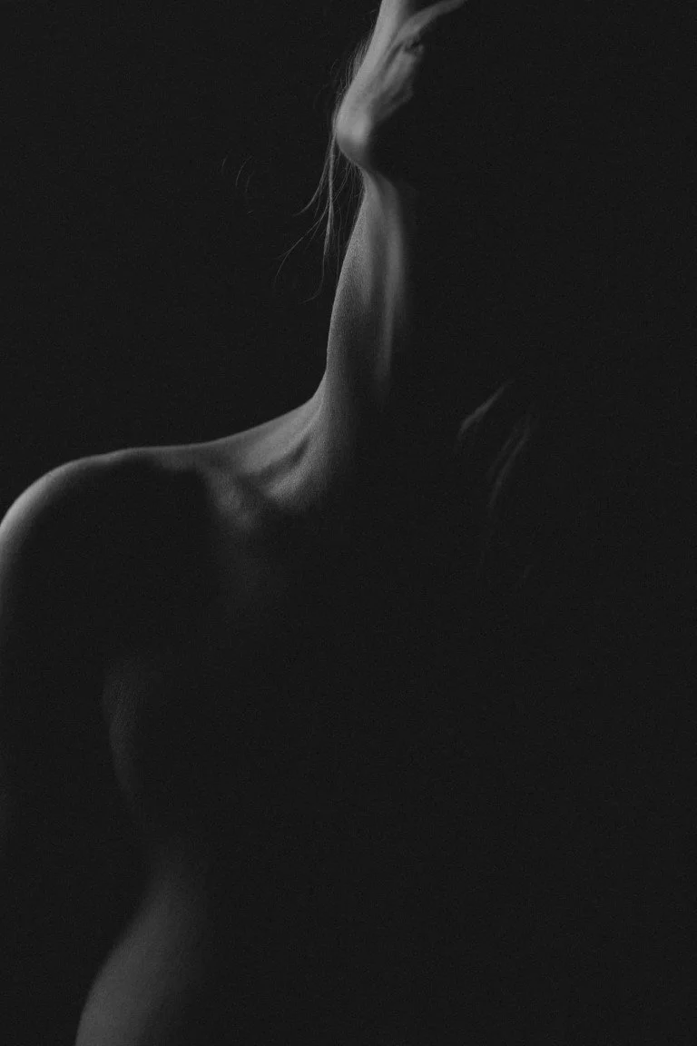 Ce qui est intéressant dans le déroulement de cette séance, c’est que j’ai débuté avec le 35mm. Je cherchais un peu l’inspiration, j’ai opté pour des compositions en plongée… Après une ou deux photos je me suis dit ok et après. Et là, j’ai ressorti mon précieux chouchou que j’aime tant mais que j’oublie trop souvent : mon 85mm… Et là, c’est évident. Je travaille avec une expo très basse pour que la lumière effleure que certaines courbes. Et c’est parti, l’inspiration arrive. Je me retrouve alors dans ma bulle et dans une ambiance qui correspond parfaitement à mon mood. J’avais besoin de douceur et de tendresse. C’est difficile d’expliquer la sensation mais ça m’a fait du bien. Et puis c’est là que j’ai réussi à faire la photo de mon cou que je visualisais depuis plusieurs mois ^^ J’ai aussi réalisé pas mal d’images de mon dos, que j’exploite que très rarement finalement alors qu’il offre une belle dimension.